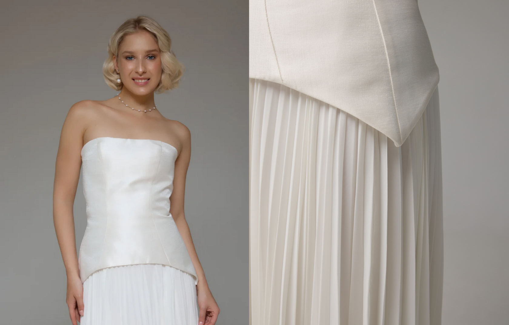 Премиальная линия отличается сложным кроем и дорогими тканями. В этой модели корсет с косточками идеально фиксирует талию, а плиссированная юбка из шифона добавляет лёгкости. Плиссировка сейчас на пике моды — она создаёт динамику при каждом шаге. Рекомендуется девушкам с фигурой «груша»: плиссе уравновешивает широкие бёдра.