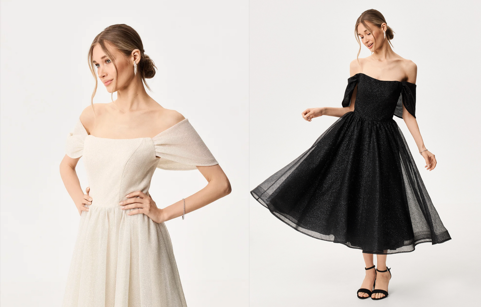 - Перевёрнутый треугольник (широкие плечи, узкие бёдра): обратите внимание на модели с открытыми плечами, V-образным вырезом и пышной юбкой или плиссе.